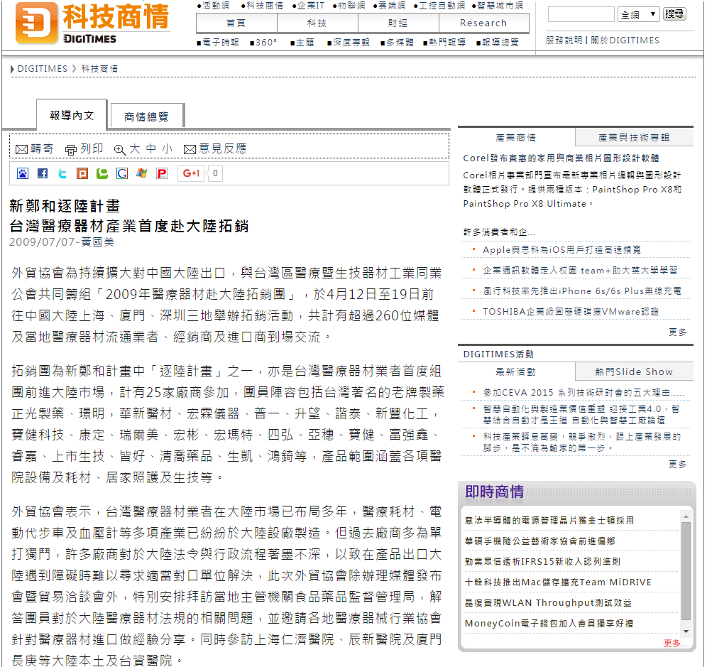 新聞報導:新鄭和逐陸計畫 台灣醫療器材產業首度赴大陸拓銷 - DIGITIMES