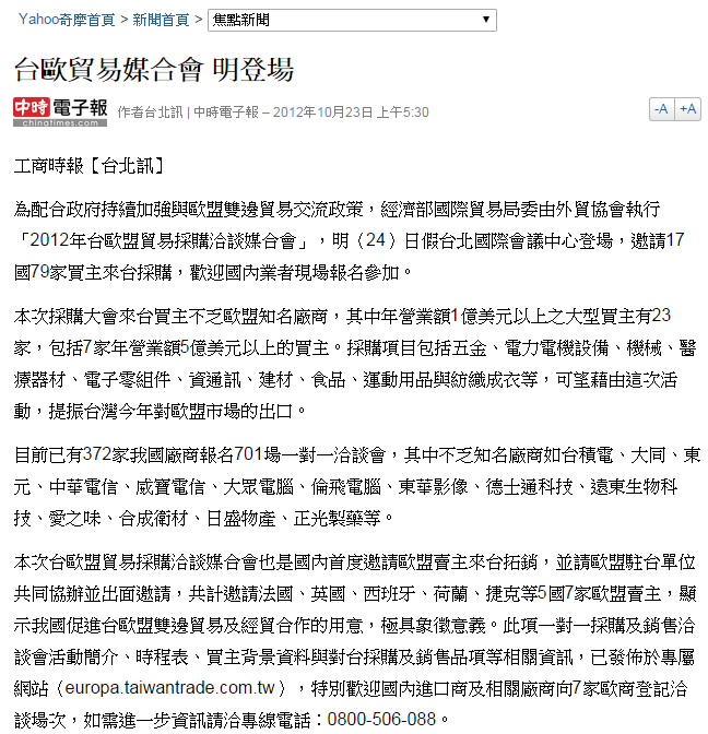 為配合政府持續加強與歐盟雙邊貿易交流政策,經濟部國際貿易局委由外貿協會執行「2012年台歐盟貿易採購洽談媒合會」,明(24)日假台北國際會議中心登場,邀請17國79家買主來台採購,歡迎國內業者現場報名參加。