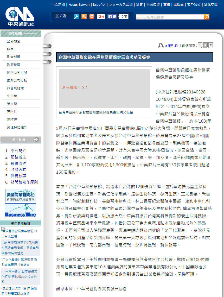 新聞報導:20140529。台灣高科技中草藥品 席捲廣州! 台灣服務貿易商情網