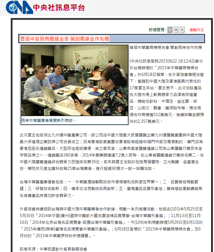 首次於台灣辦理的「2015年中草藥商機媒合會」於6月18日落幕,在外貿協會積極洽邀下,邀請到中國大陸及香港最具代表性的17家買主來台。買主表示,此次洽談產品在大陸市場上較具競爭力品項有保健產品、機能性飲料、牛樟芝、益生菌、納豆、山苦瓜、酵素、藥用貼布等,預估現場合作商機達552萬美元,後續採購金額預估約2,357萬美元。