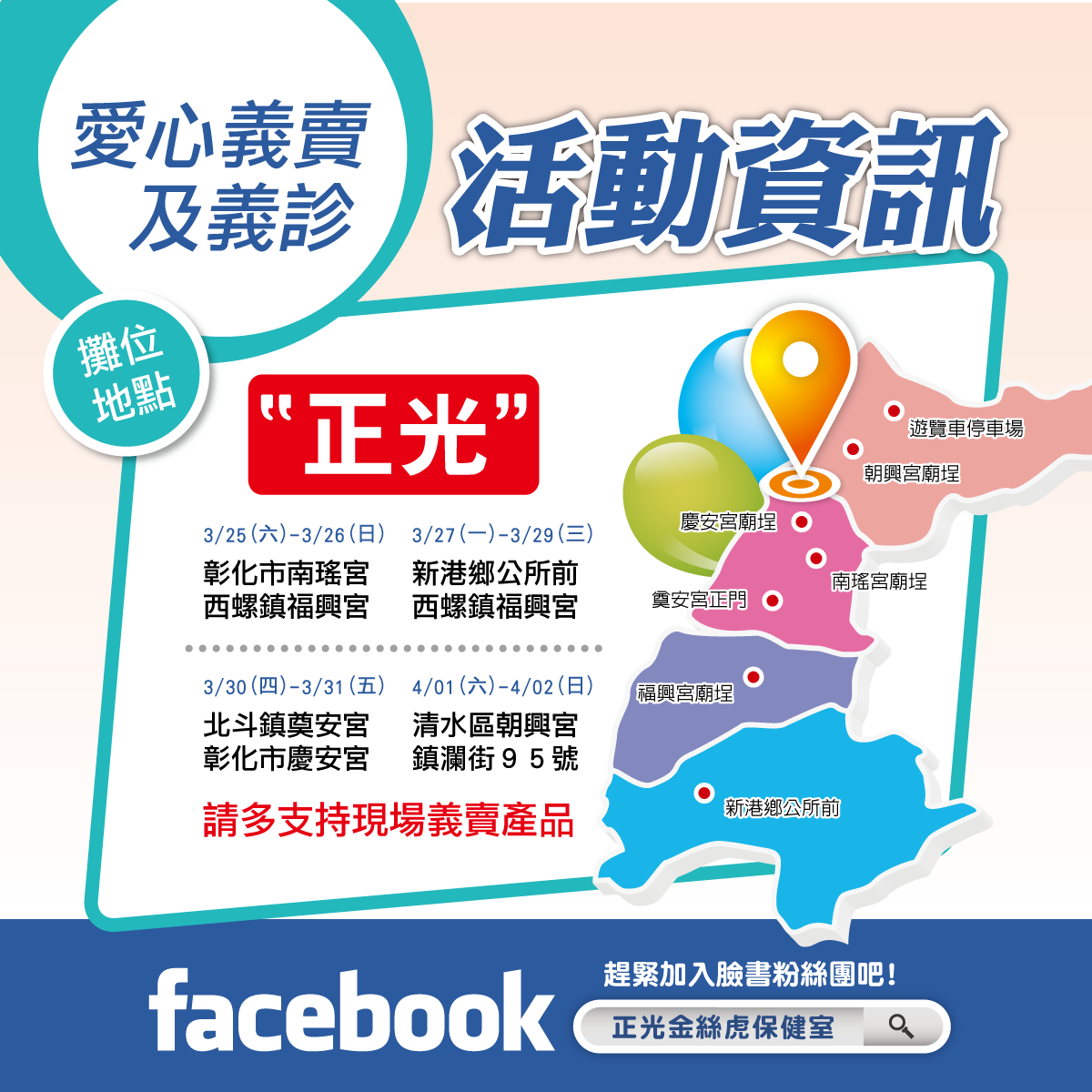 歡迎民眾到正光攤位免費推拿做愛心、按讚拿好禮!