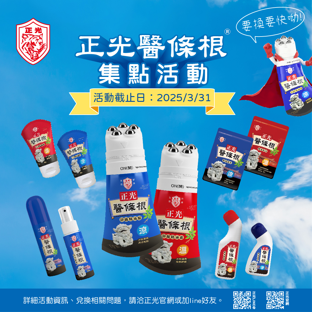 正光始終致力於為台灣人研發卓越的外用藥品與草本商品。這次,我們引以為傲地推出了正光醫條根舒緩精油霜,天然草本植物萃取精華,輕鬆無負擔,期望成為您的貼心按摩夥伴。透過這次的集點活動,我們不僅想要表達對您的感謝之情,更希望能夠以實際行動回饋您多年來的支持與厚愛,馬上開啟這趟醫條根的集點旅程!